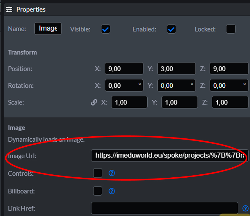 - Select the 'image' object and paste the image link in the 'Properties' window (bottom right)